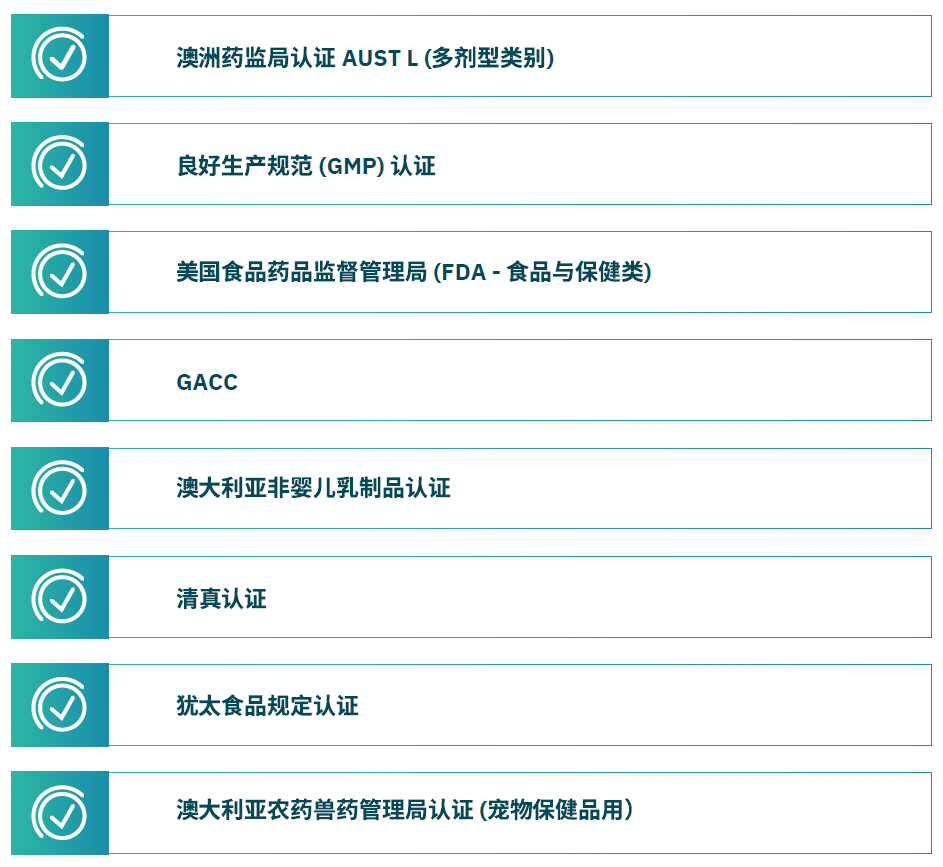 为来自超过30个国家的客户提供“澳洲制造”服务,其中包括检测以及澳洲法规相关的信息支持。拥有TGA认证的实验室并且为其配备了高度先进的技术仪器。