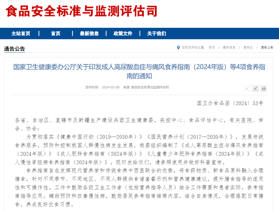 2月8日,国家卫生健康委办公厅印发《成人高尿酸血症与痛风食养指南(2024年版)》、《成人肥胖食养指南(2024年版)》、《儿童青少年肥胖食养指南(2024年版)》、《成人慢性肾脏病食养指南(2024年版)》4项食养指南。