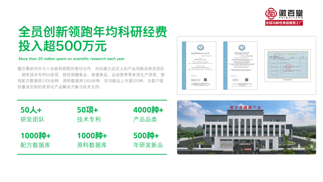 安徽徽百堂健康产业有限公司 (以下简称“徽百堂健康产业”)是一家集健康产品的科研、生产、销售、服务为一体化的综合型企业。徽百堂健康产业深耕大健康产业10余载,专业从事保健食品、膳食营养补充剂、运动营养特殊膳食、养生茶饮、功能性饮料、营养果冻等产品OEM/ODM贴牌代加工服务。能够为合作伙伴提供卓越的产品解决方案,以精准覆盖市场需求的10000+成熟产品方案,满足各类品牌方多元化大健康产品定制需求。