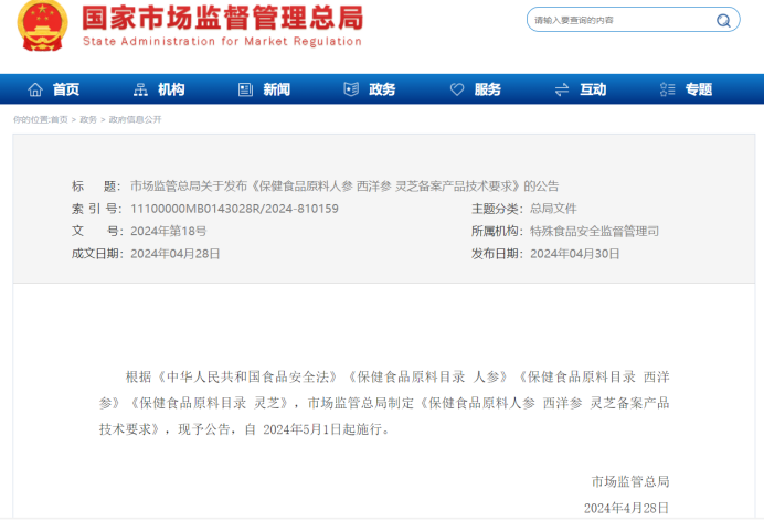 2024年4月30日,市场监管总局正式公告《保健食品原料人参 西洋参 灵芝备案产品技术要求(2024年第18号)》(以下简称《技术要求》),自 2024年5月1日起施行。